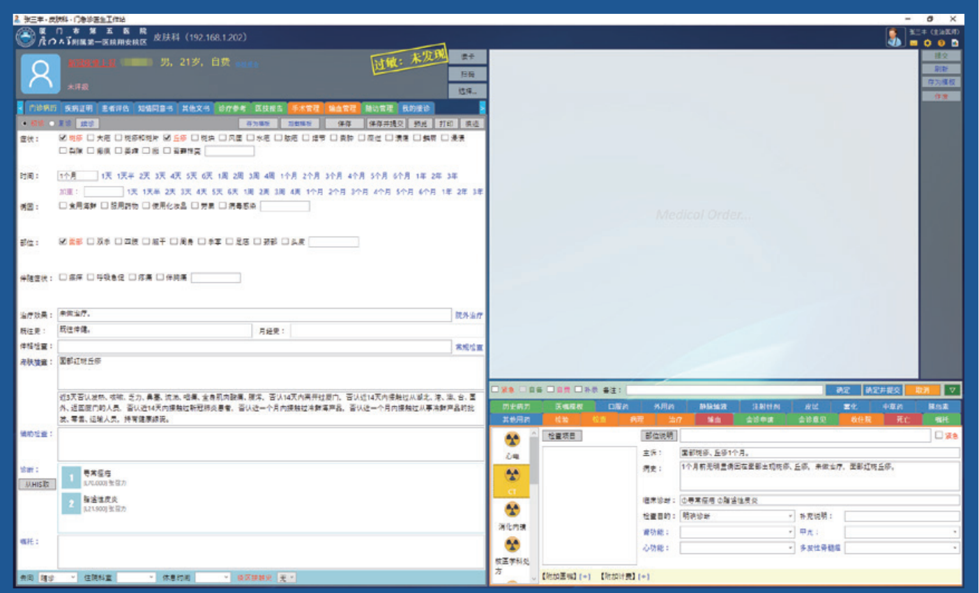 門診電子病歷系統(tǒng)采用一體化設(shè)計,從刷卡、掛號到寫病歷、開醫(yī)囑都在一套系統(tǒng)中完成,門診病歷具有初診、復(fù)診和續(xù)診模式,支持CA電子簽名和時間戳,提交后生成具有可靠電子簽名的病歷文檔,滿足無紙化需要。